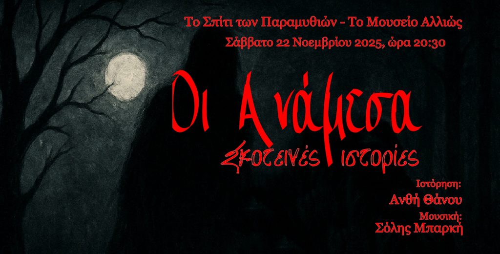 «Οι Ανάμεσα» έρχονται στο Σπίτι των Παραμυθιών – Το Μουσείο Αλλιώς, το Σάββατο 22 Νοεμβρίου 2025, ώρα 20:30. Μετά τη μεγάλη επιτυχία της παράστασης στην 23η Γιορτή Παραμυθιών, η Ανθή Θάνου και ο Σόλης Μπαρκή έρχονται ξανά ανάμεσα μας.